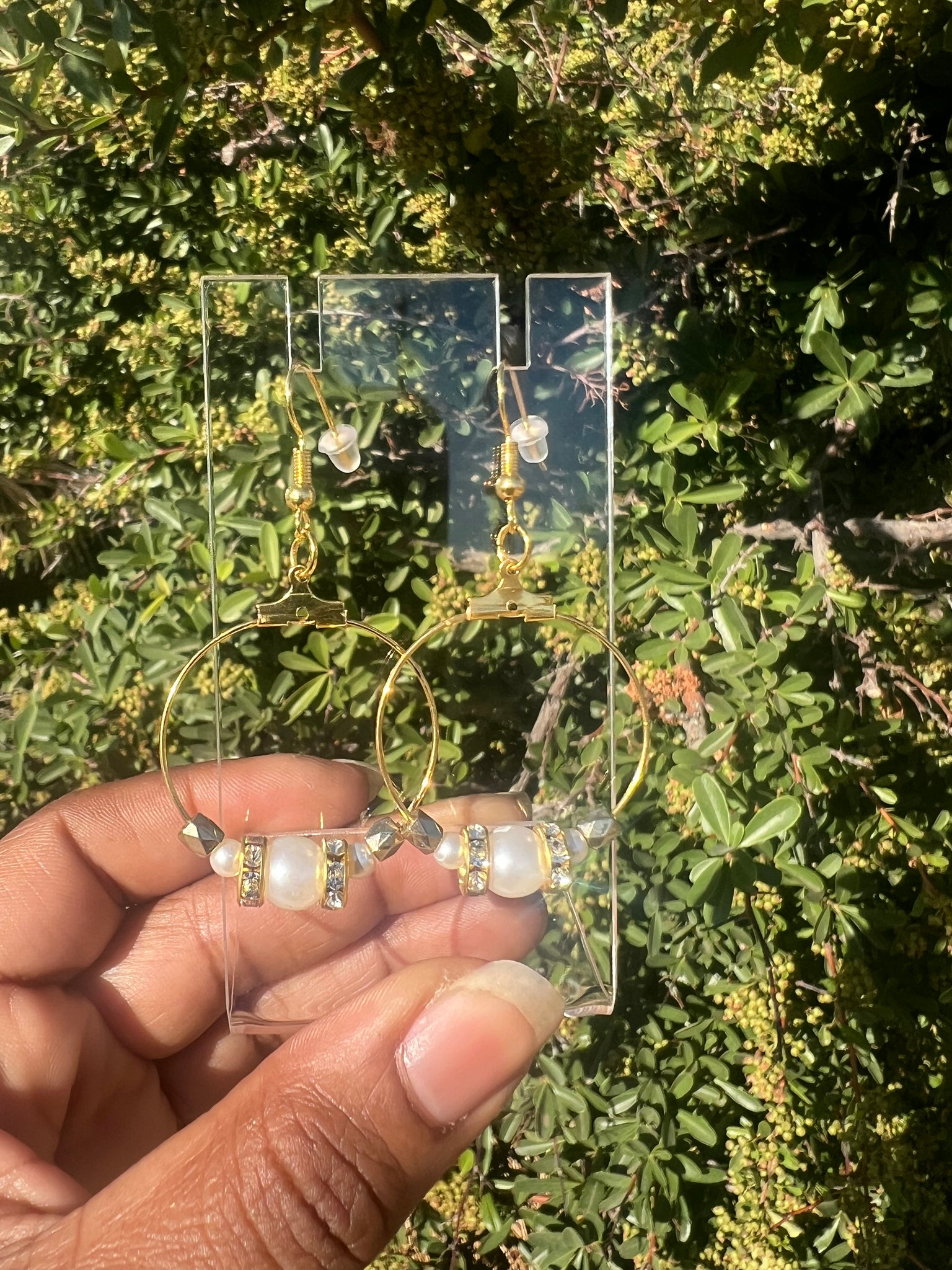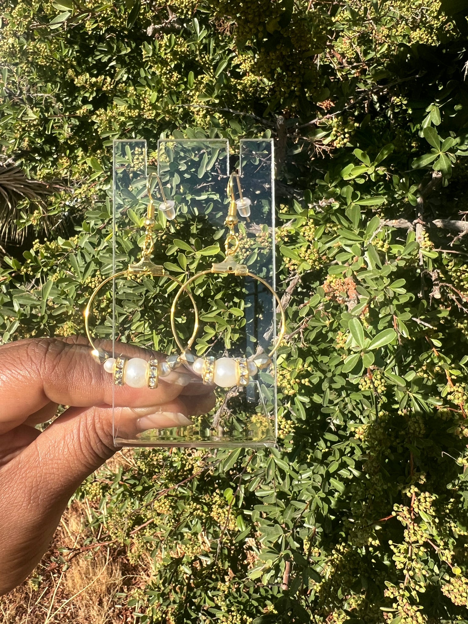 Gold plated copper hoop earrings with creamy white faux pearl beads, crystal rhinestone spacer. Hoop earring hooks are made of high-quality copper material, lead-free, nickel-free, durable and sturdy, not easy to fade or rust. Size about. 6.1 × 4.53 × 0.67 inches.